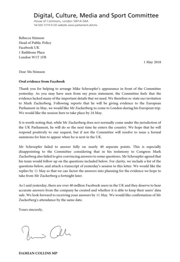 “Following reports that he will be giving evidence to the European Parliament in May, we would like Mr. Zuckerberg to come to London during his European trip. We would like the session here to place by 24 May,” the committee writes in its latest letter to the company, signed by its chair, Conservative MP Damian Collins.